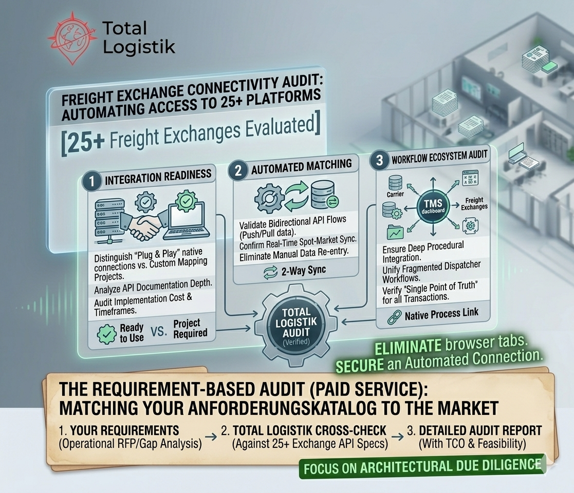 Automating your freight exchange access is a technical investment that must yield a clear ROI. We use your specific Requirement Catalog (Anforderungskatalog) to perform a deep-dive comparison against our exchange database.